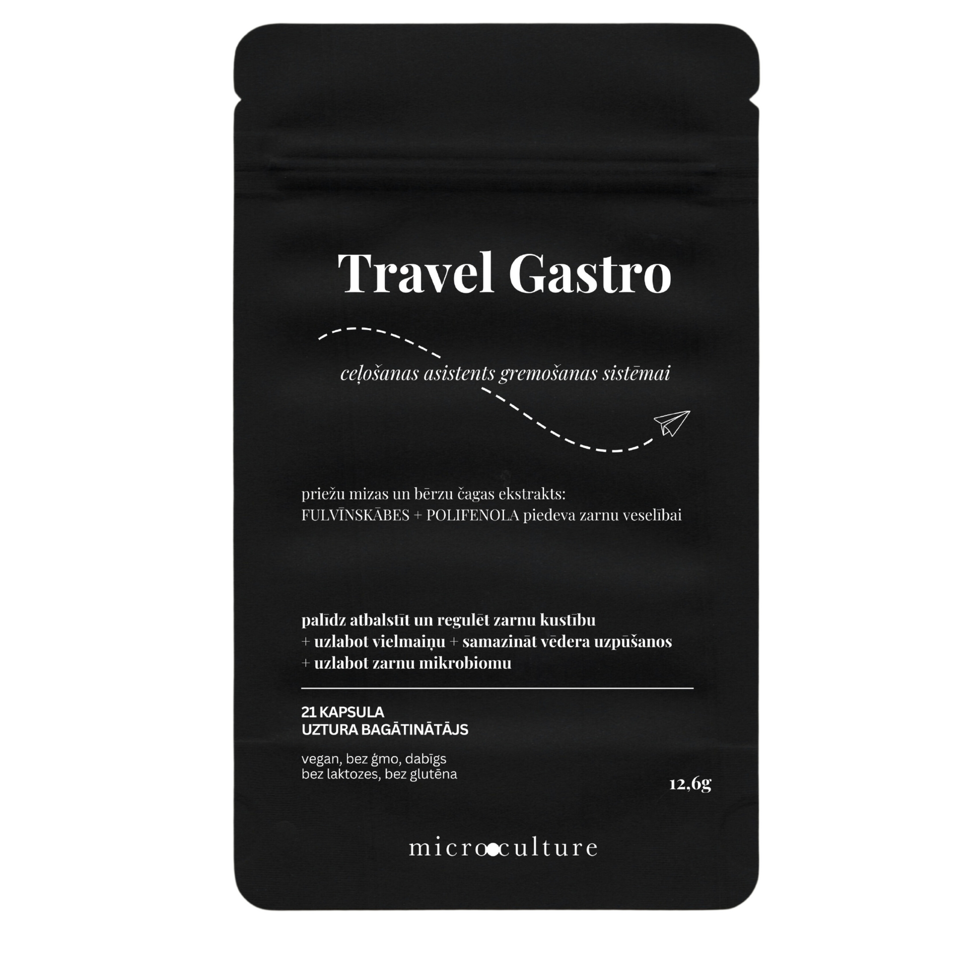 Produkts izstrādāts, lai sagatavotu organismu šokam, ko tas piedzīvo ceļojumu laikā. Jauni ēdieni, ritmi, vide ietekmē mūsu kuņģa mikrobiomu, kas var izraisīt gremošanas sistēmas diskomfortu. Travel Gastro palīdzēs dabīgi ķermenim pašam pārvarēt šo šoku! To var lietot gan ceļojumos, gan profilaktiski, lai uzlabotu kuņģa mikrobiomu. Profilaksei aicinām lietot 1 kapsulu/dienā (iepakojums tad ilgs 3 nedēļas)